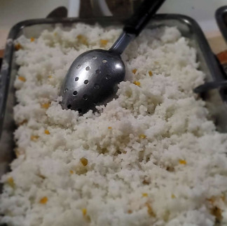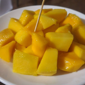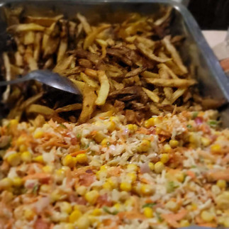 Le soir, retour au camp pour un festin : salade de choux, maïs, carottes, poulet aux oignons, riz, frites et pour finir, une mangue à tomber. On s'est régalés !
