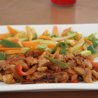 Le déjeuner a été un régal : un poulet pané accompagné de loco (bananes plantain frites) pour moi, et un émincé de poulet à la provençale avec des légumes pour Adèle.